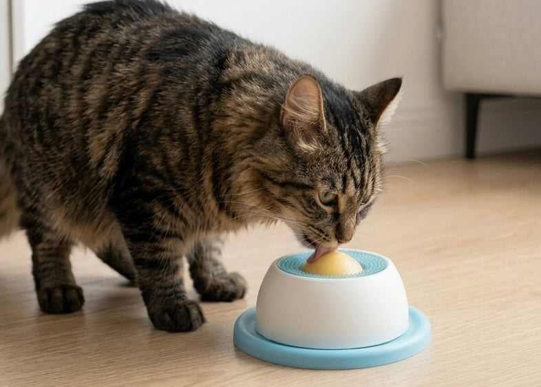 the interactive bowl works best with soft or semi-soft foods like yogurt, peanut butter (pet-safe), wet food, pâté, or mashed treats. The thicker the texture, the longer the entertainment.